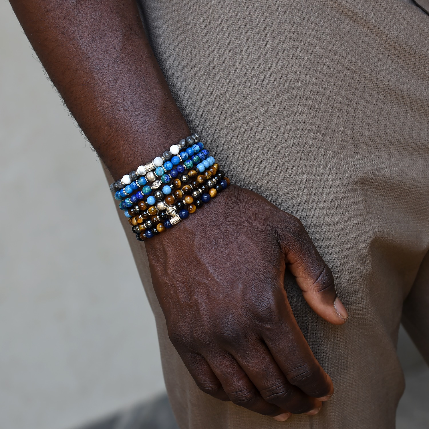 RELAX è il bracciale artigianale in argento 925 con occhio di tigre giallo, agata nera lucida e giada Mashan blue: un portafortuna elegante e discreto, fatto a mano in Italia.