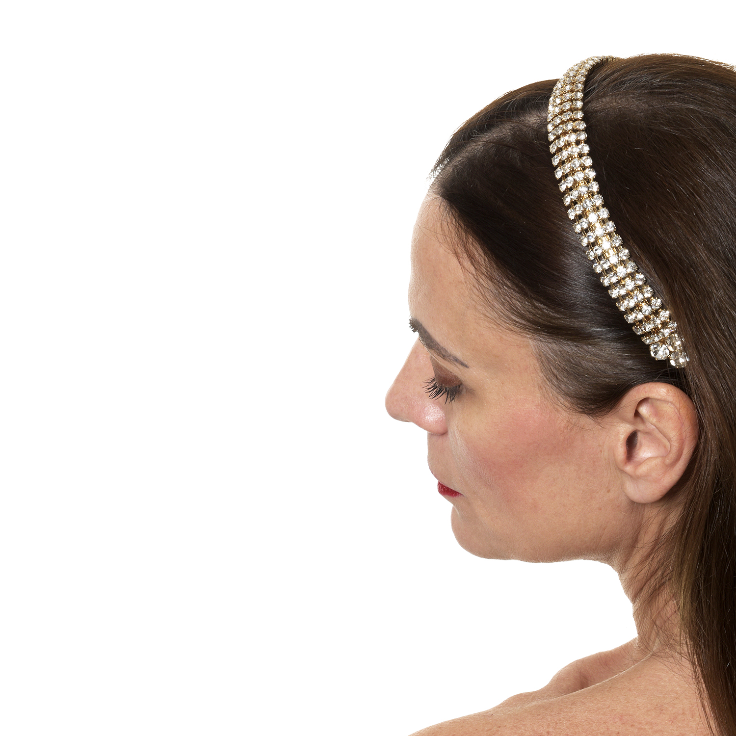 Un cerchietto sottile tempestato di strass in cristallo che cattura la luce con eleganza. Il profilo pulito e la brillantezza delicata donano un accento raffinato ai look quotidiani e agli outfit da sera. Leggero e confortevole, si indossa tutto il giorno senza pressione. Perfetto per matrimoni, eventi e styling minimal che vogliono un tocco luminoso.