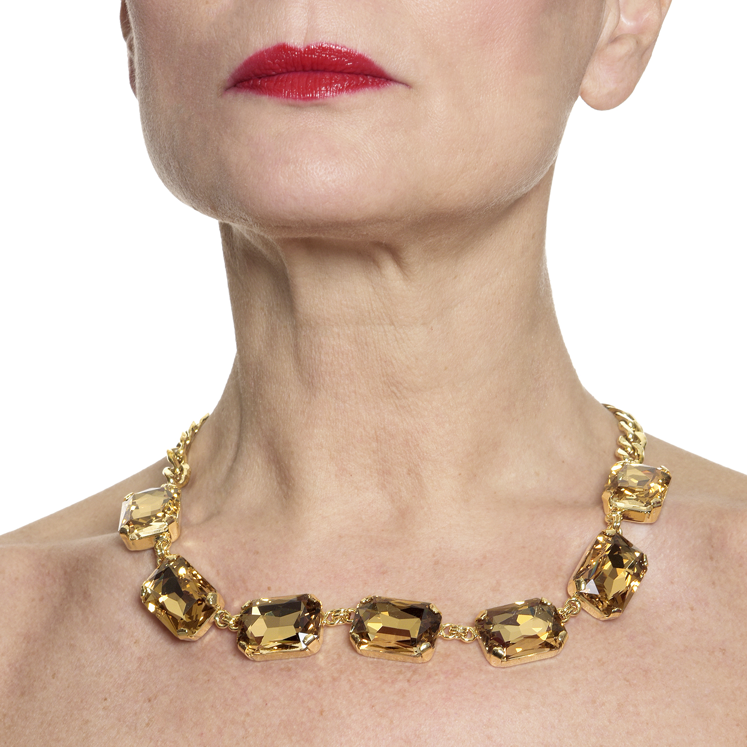 Collana con cristalli color oro, si può usare come choker, lavorata e incastonata a mano con preziosi cristalli che danno un tocco di classe al gioiello. Placcata oro 18 kt.