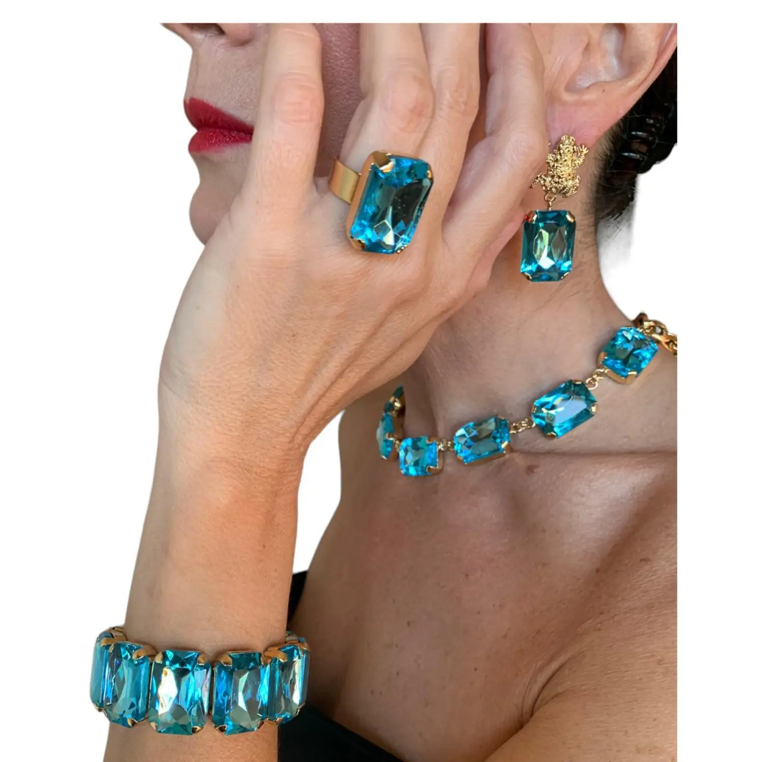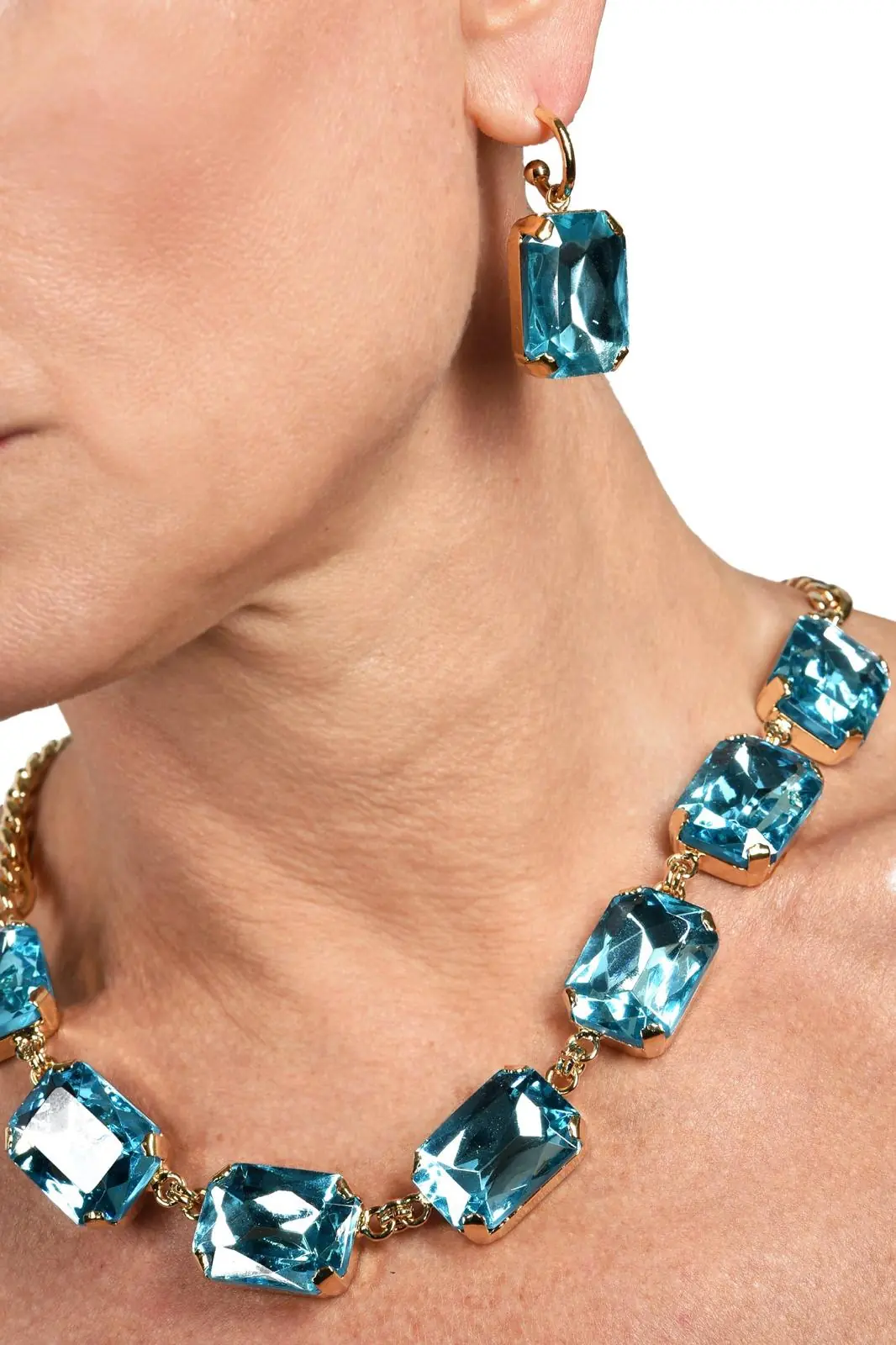 Cristalli color acqua azzurra. Placcata oro 18 kt. Fatto a mano. Made in Italy. Lunghezza 54 cm