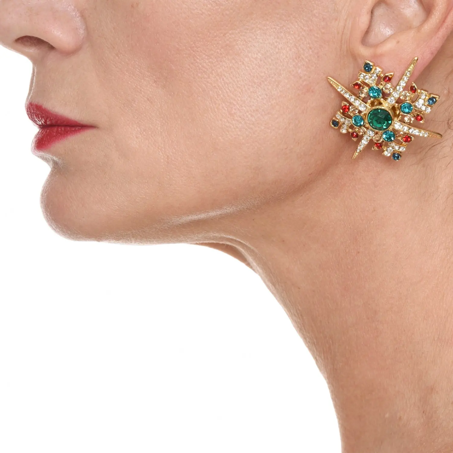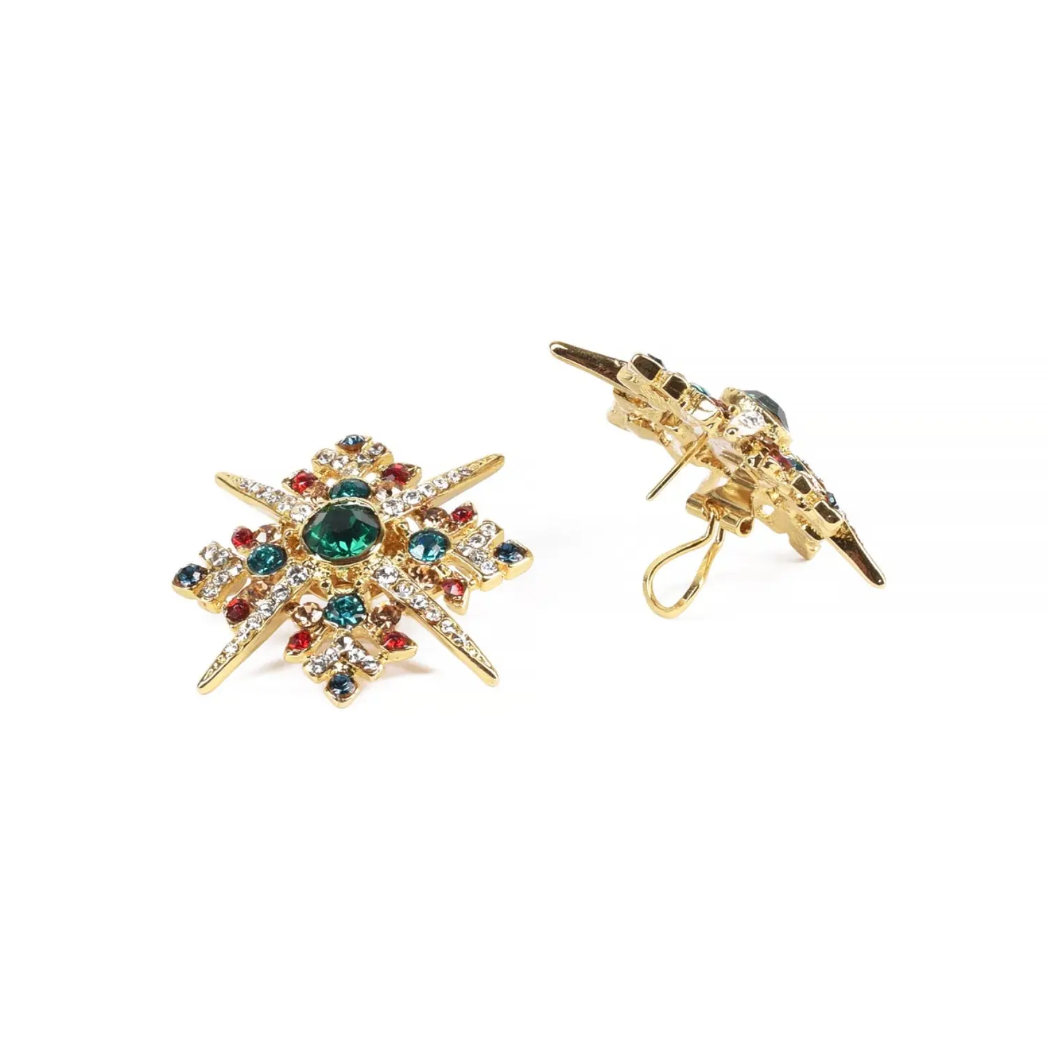 Come questo orecchino in forma di croce con cristalli, incastonati a mano, che danno luminosità e brillantezza catturando l’attenzione e conferiscono un senso di lusso e raffinatezza. Placcato oro 18 kt.