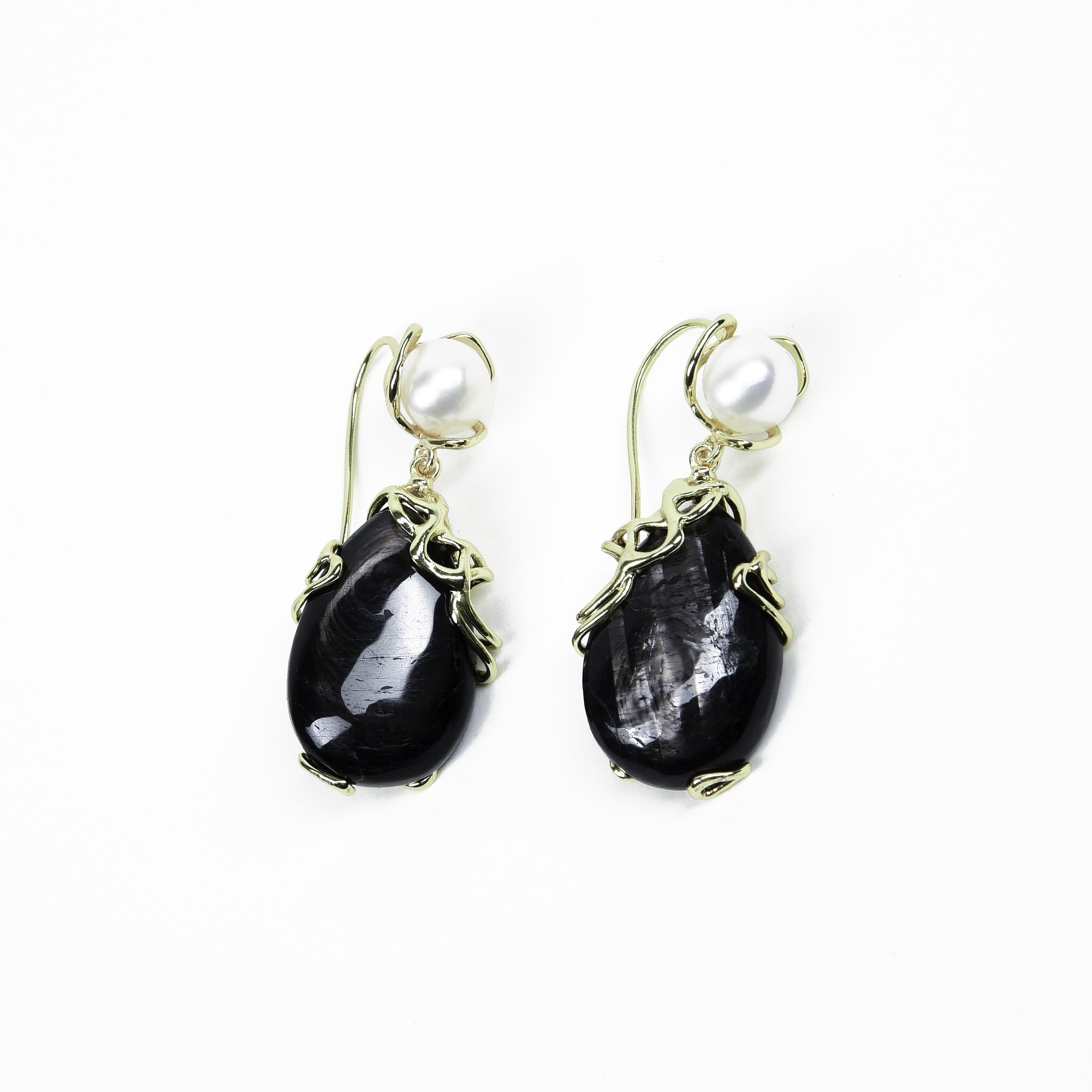 Orecchini a monachella di bronzo con perle di Maiorca e pendente cabochon ossidiana.