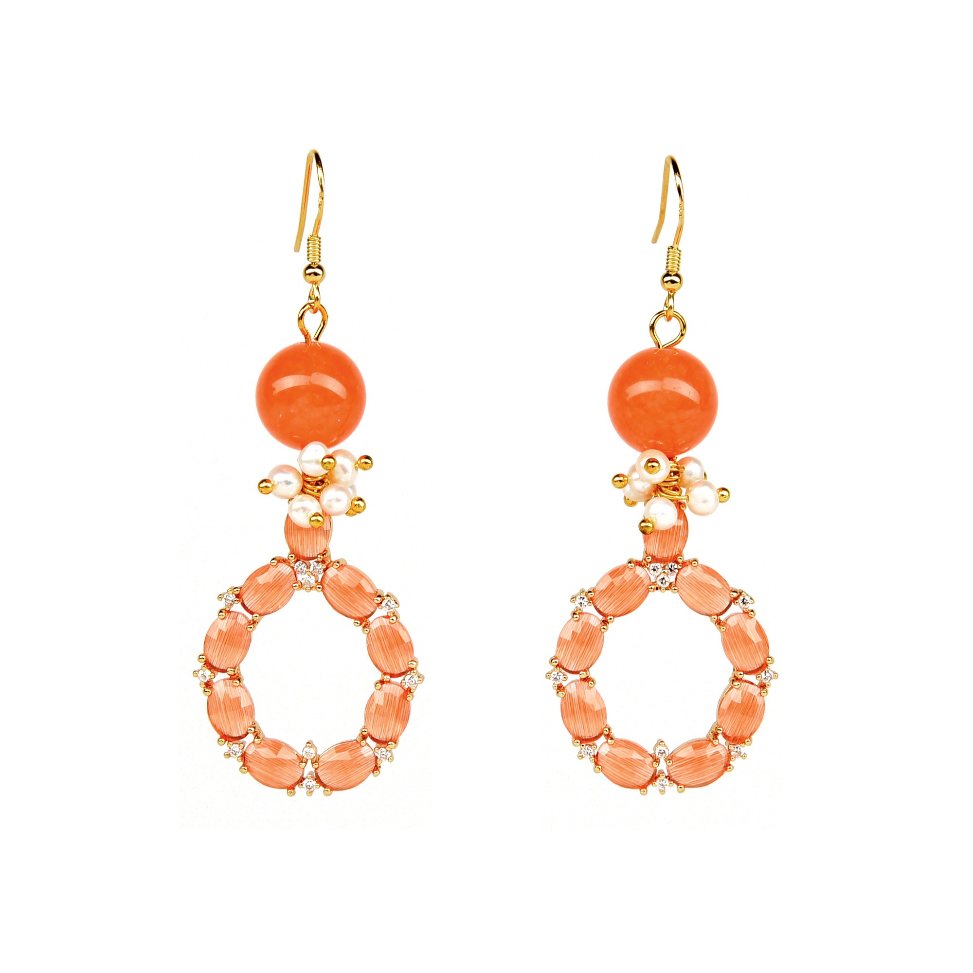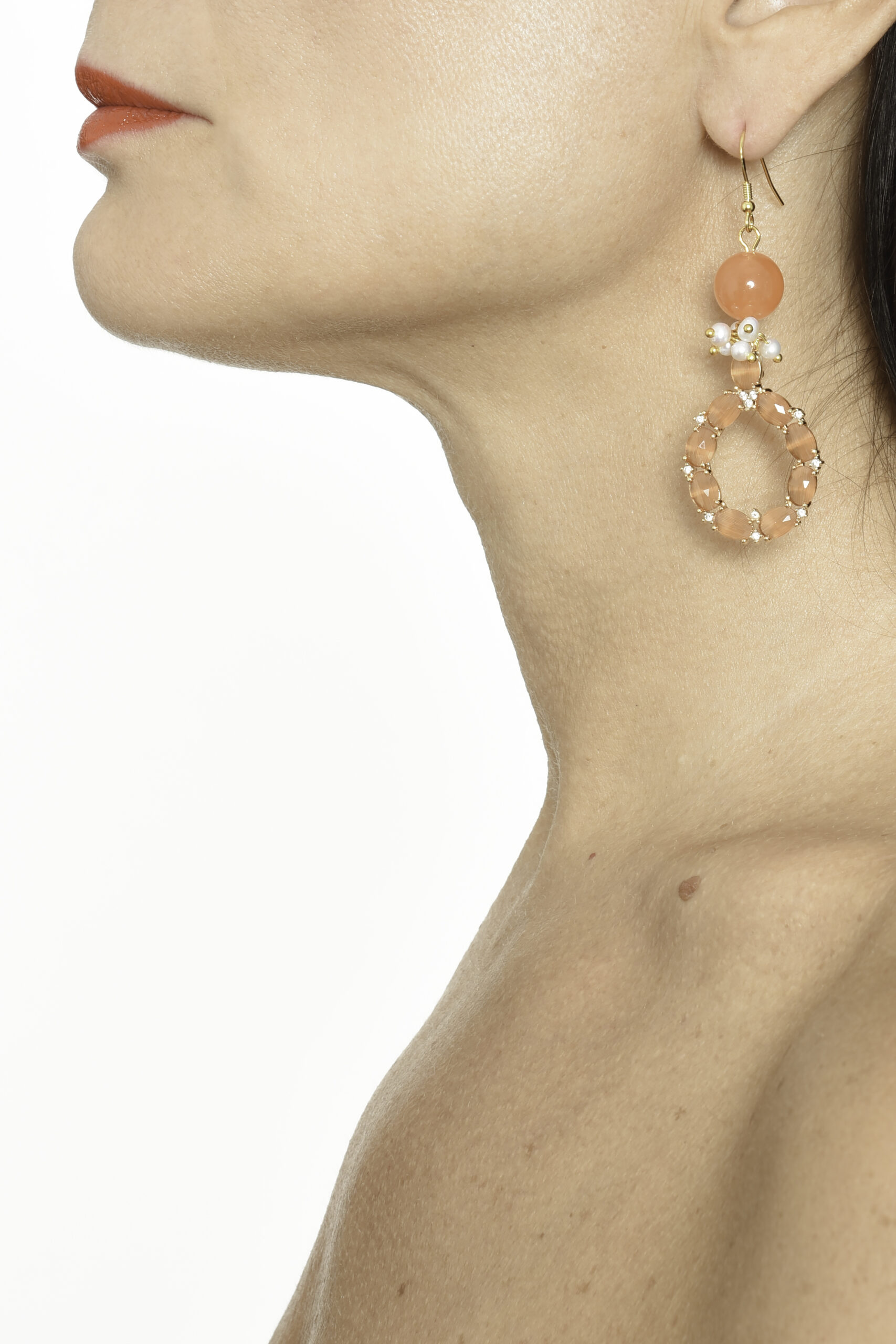 Orecchini a monachella di argento 925, con pietre e perle con pendente in occhio di gatto arancione e zirconi.