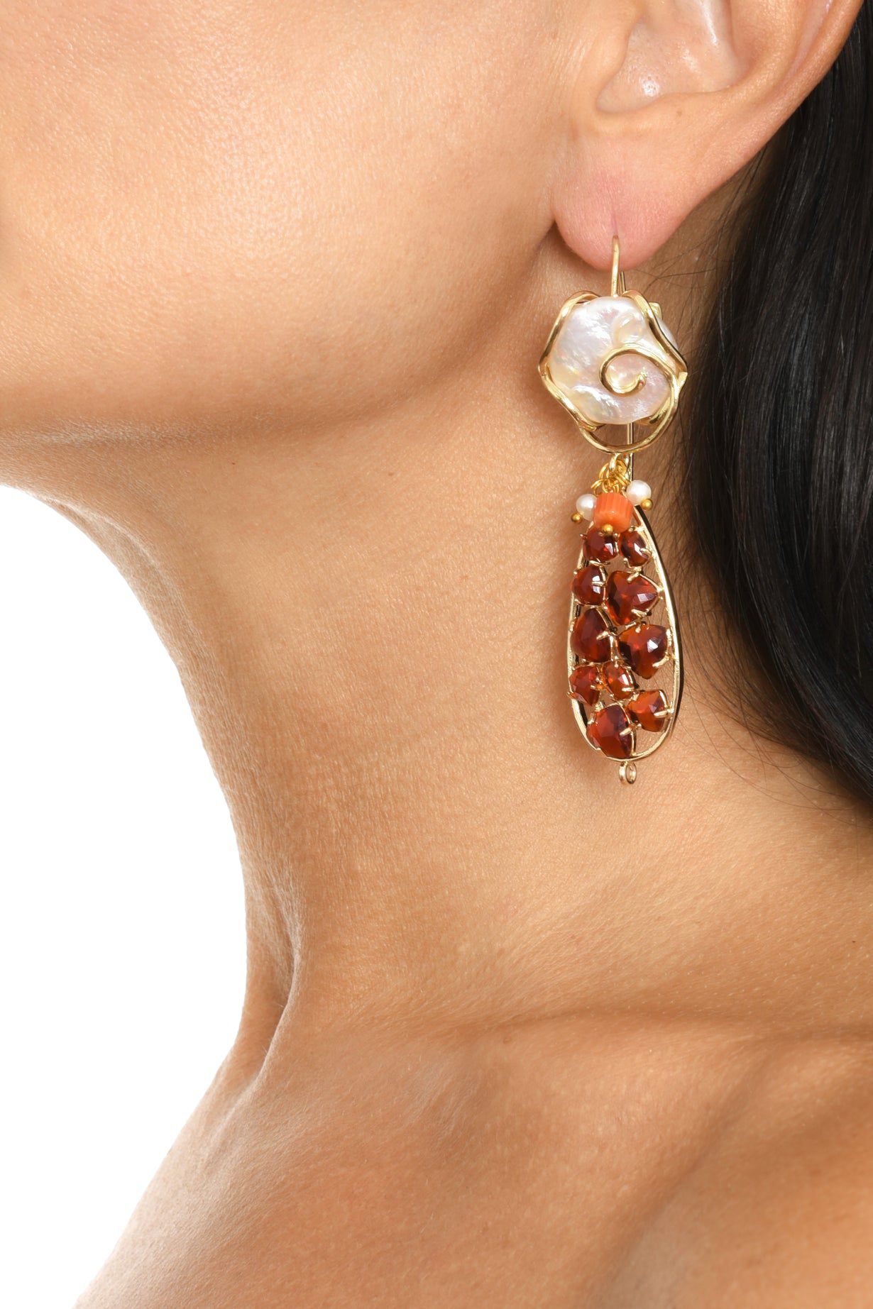 Orecchini con perle e pietre di occhio di gatto color rosso. Dimensioni: 21 mm x 80 mm Made in Italy 100% hand made