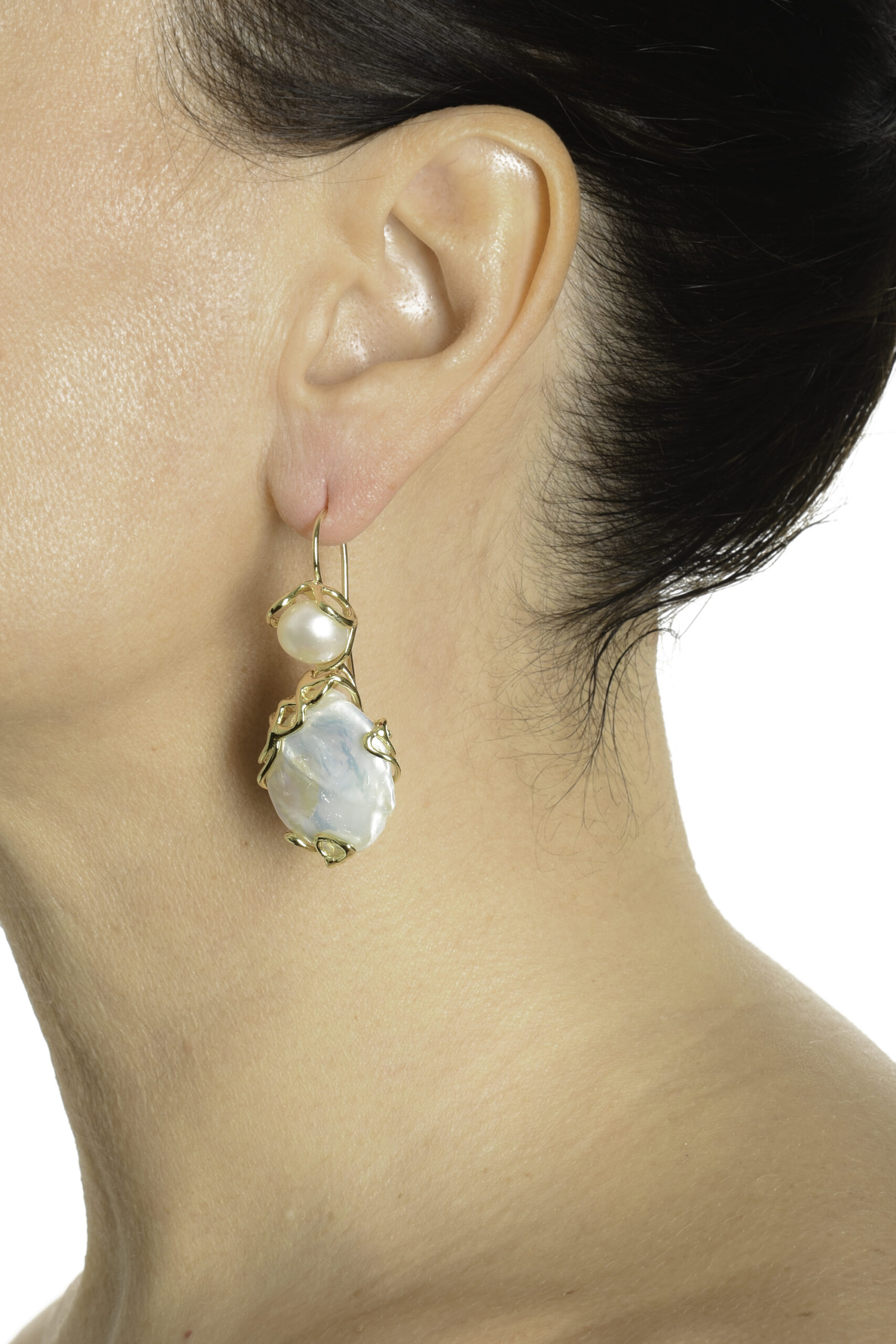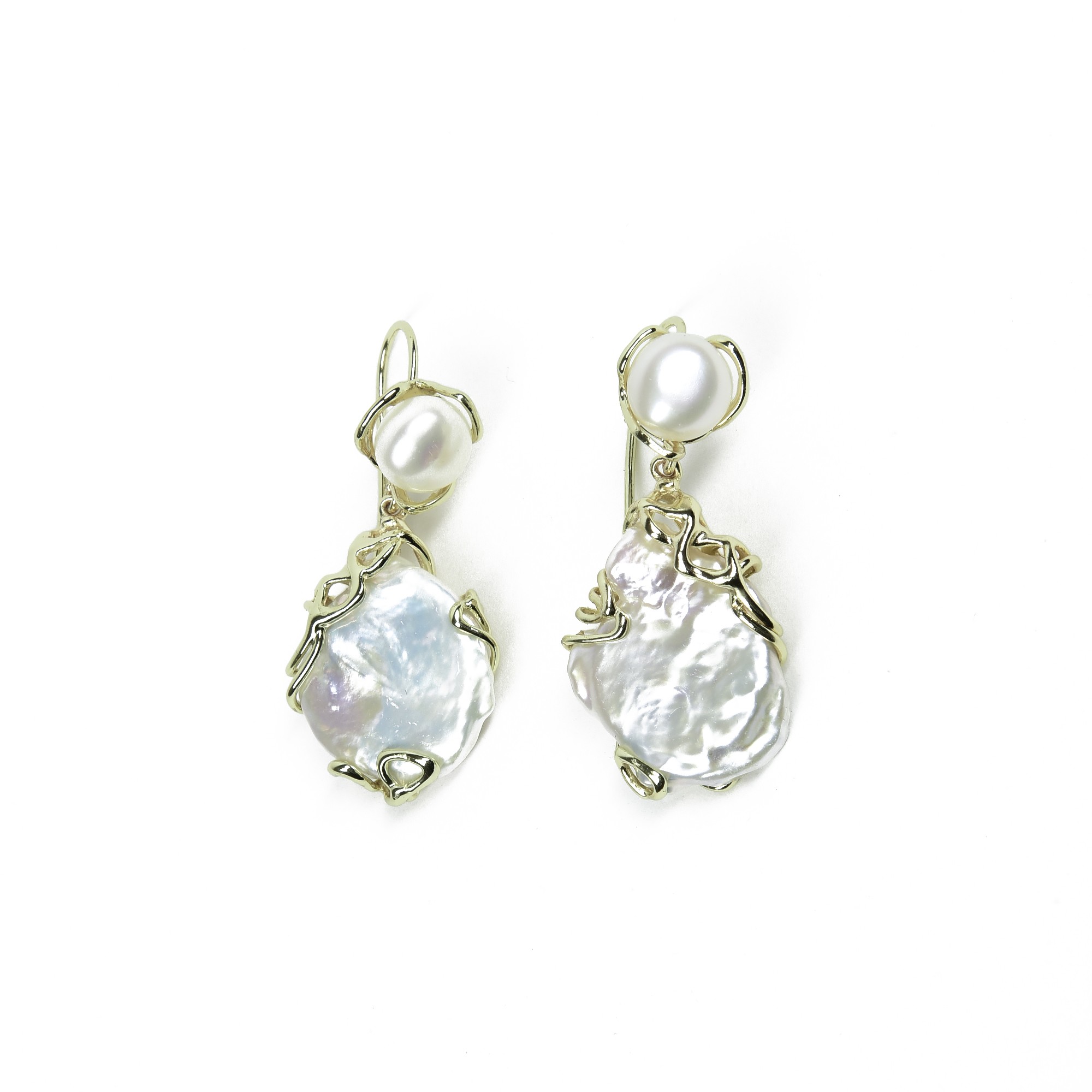 Orecchini a monachella di bronzo con perle fiume e pendente con perle.