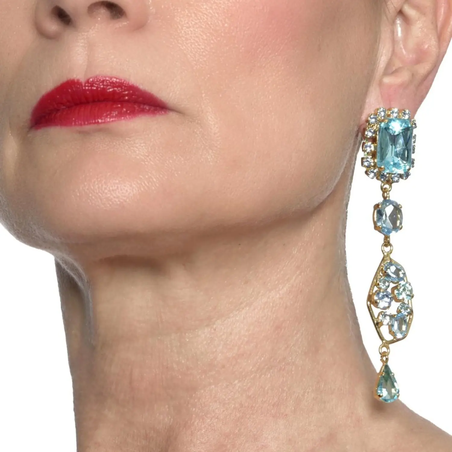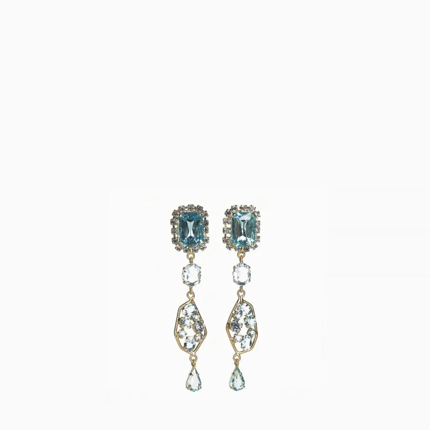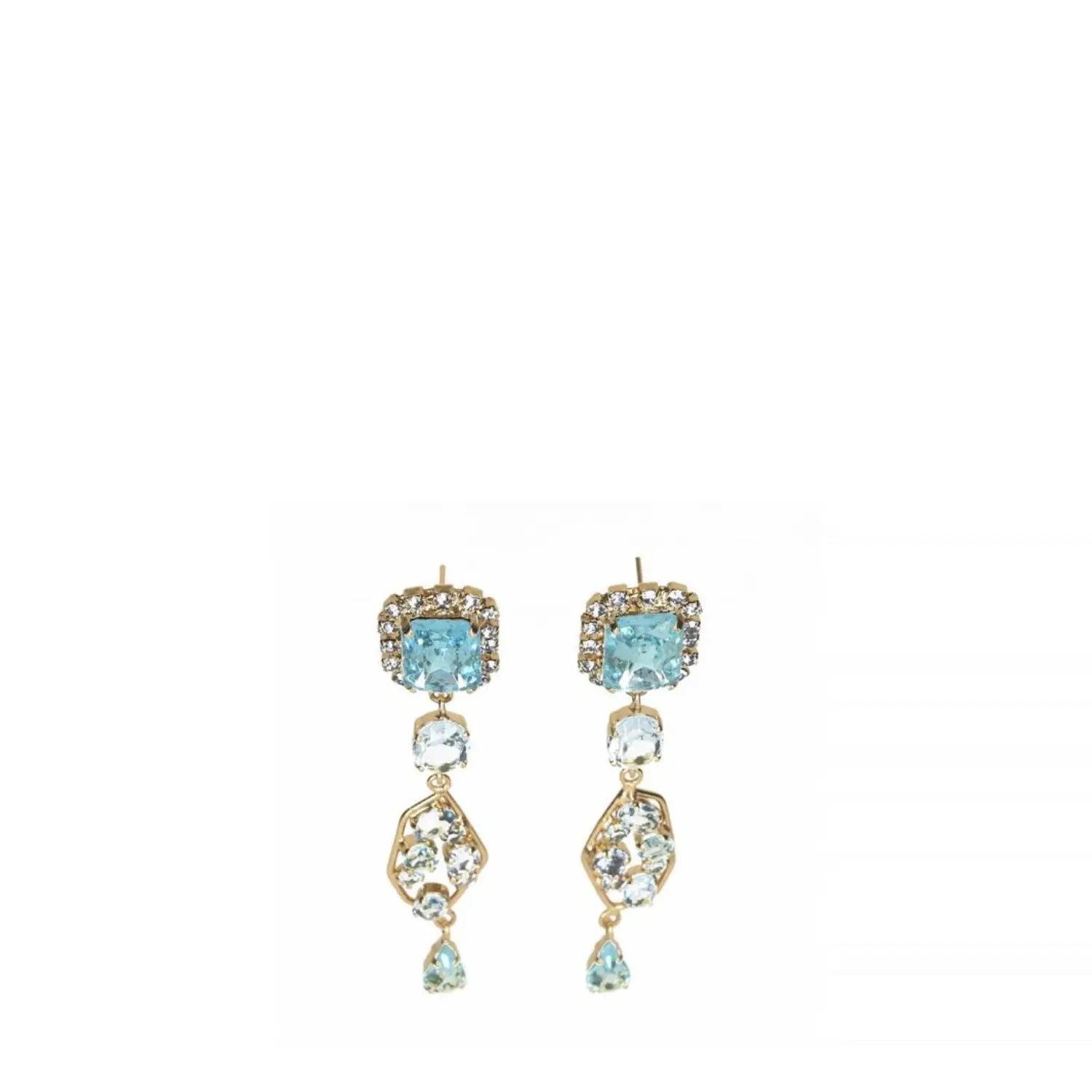 Ogni orecchino presenta cristalli acqua azzurra incastonati a mano, che brillano come gocce di pioggia illuminate dalla luce del sole. La delicata forma pendente evoca un senso di leggerezza e movimento, ricordando le nuvole che danzano nel cielo.
